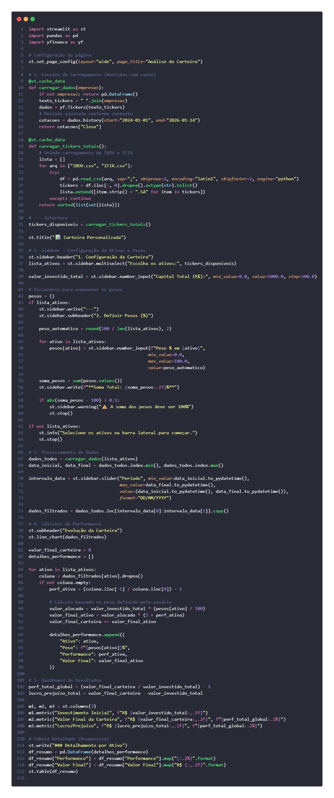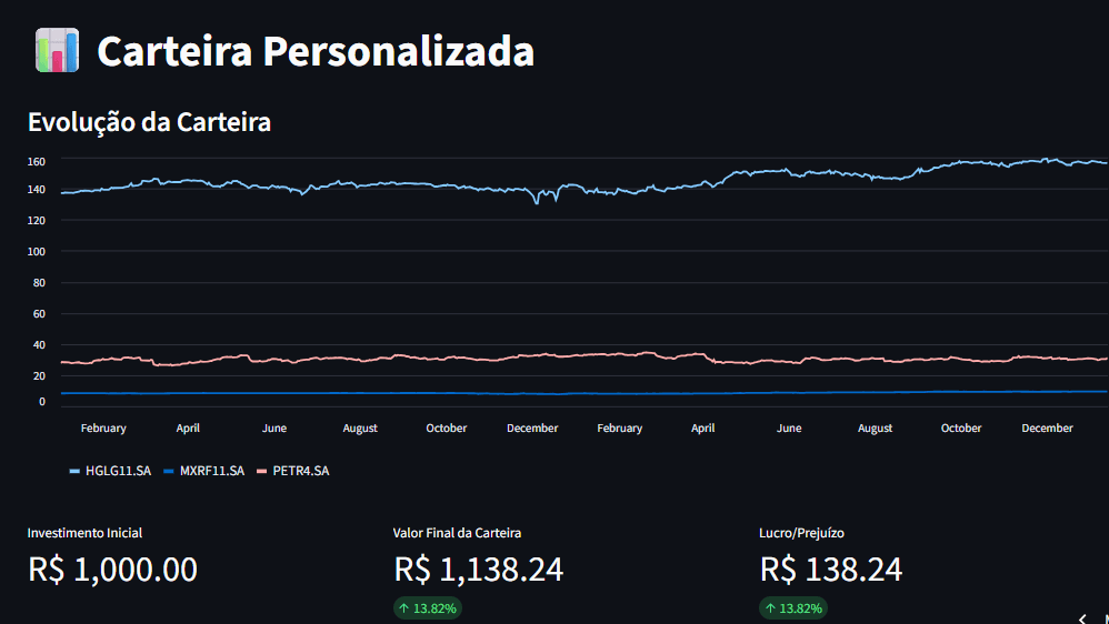 A aplicação permite ao usuário selecionar ativos, definir períodos de análise, visualizar gráficos de preços e calcular a performance individual e total de uma carteira de investimentos simulada.