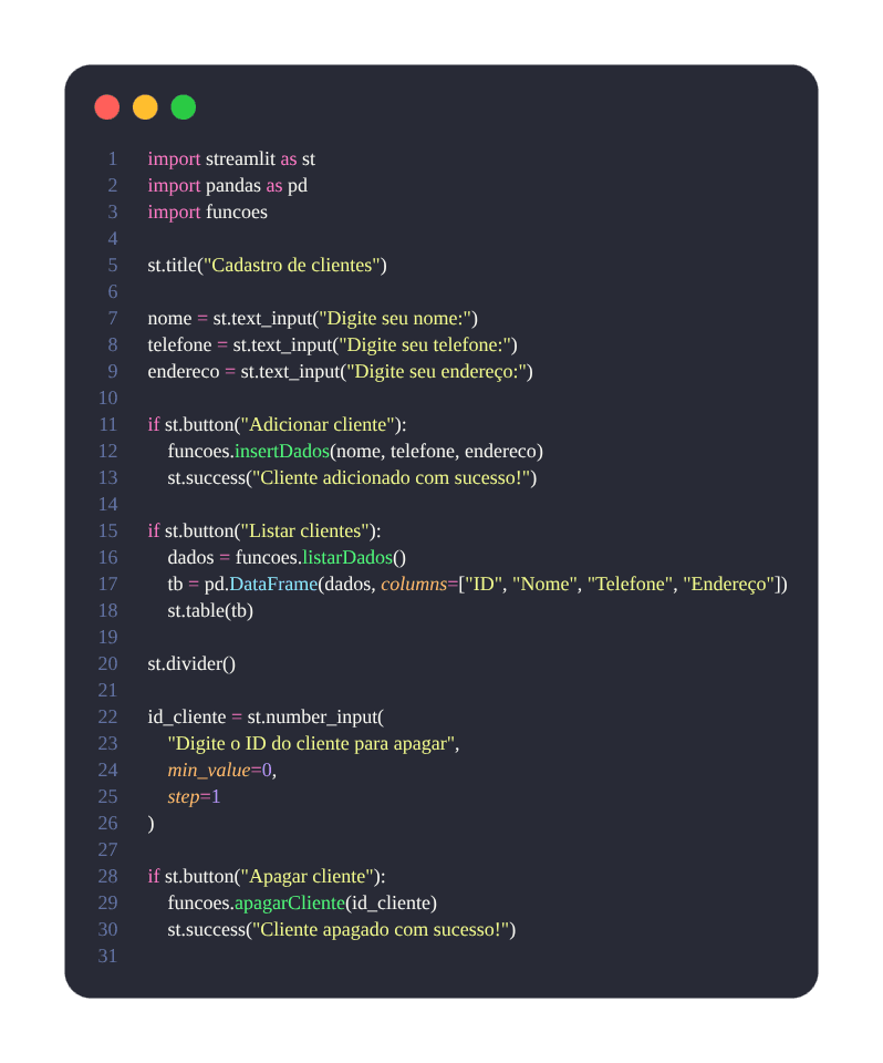 banco.py→ banco de dadosfuncoes.py→ regras de negóciointerface.py→ interface do usuário